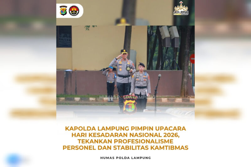 BANDAR LAMPUNG – Mediaintelijen.id – Suasana khidmat dan penuh semangat menyelimuti halaman Mako Polda Lampung pada hari Jumat, 17 April 2026. Bertindak selaku Inspektur Upacara, Kapolda Lampung, Irjen Pol Helfi Assegaf, S.I.K., M.H., memimpin langsung pelaksanaan Upacara Bendera Hari Kesadaran Nasional Tahun 2026 yang diikuti oleh seluruh jajaran pimpinan dan personel di lingkungan Polda Lampung.