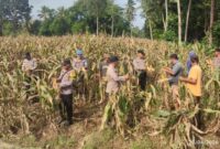 DUKUNG PROGRAM KETAHANAN PANGAN NASIONAL, BHABINKAMTIBMAS POLSEK LABUHAN MARINGGAI LAKSANAKAN MONITORING DAN IKUT PANEN JAGUNG