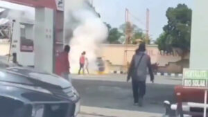 Tak berselang lama, muncul percikan api dari dalam kendaraan yang kemudian cepat membakar seluruh bagian mobil. Kejadian ini sempat menyebabkan kepanikan di kalangan petugas SPBU, karyawan, serta warga sekitar yang khawatir api akan merambat ke area pompa bbm yang berpotensi lebih berbahaya.